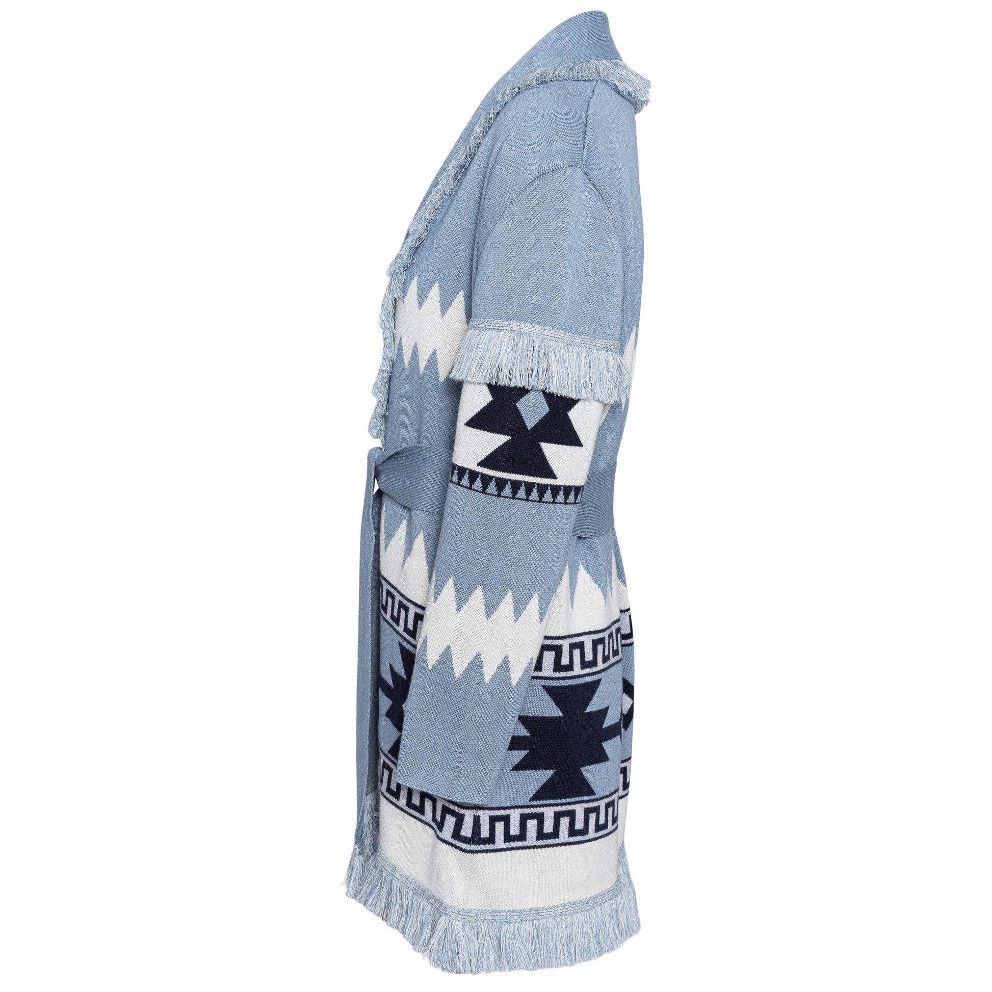 Wool blend cardi-coat with striped pique jacquard work, opening with fringes, matching belt.