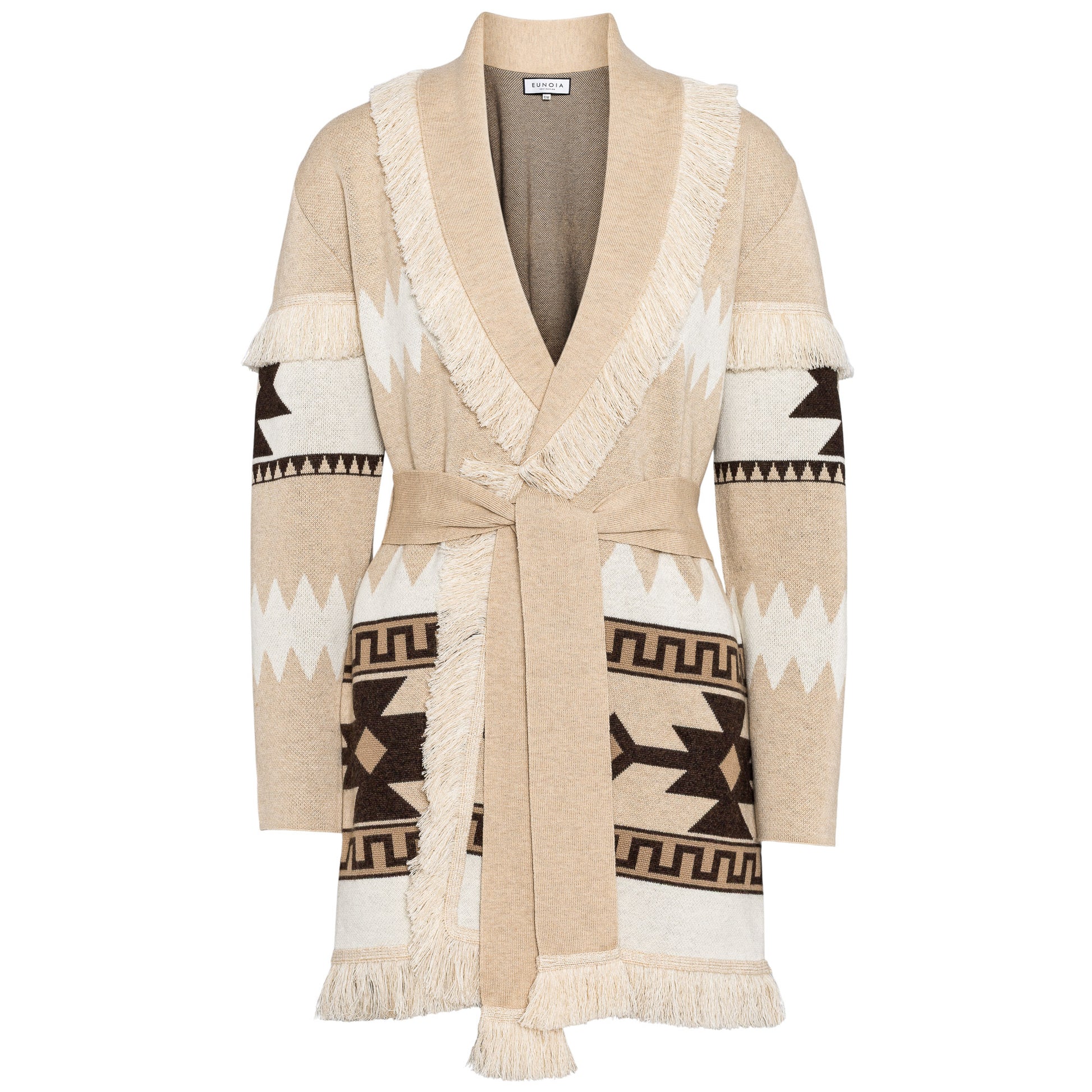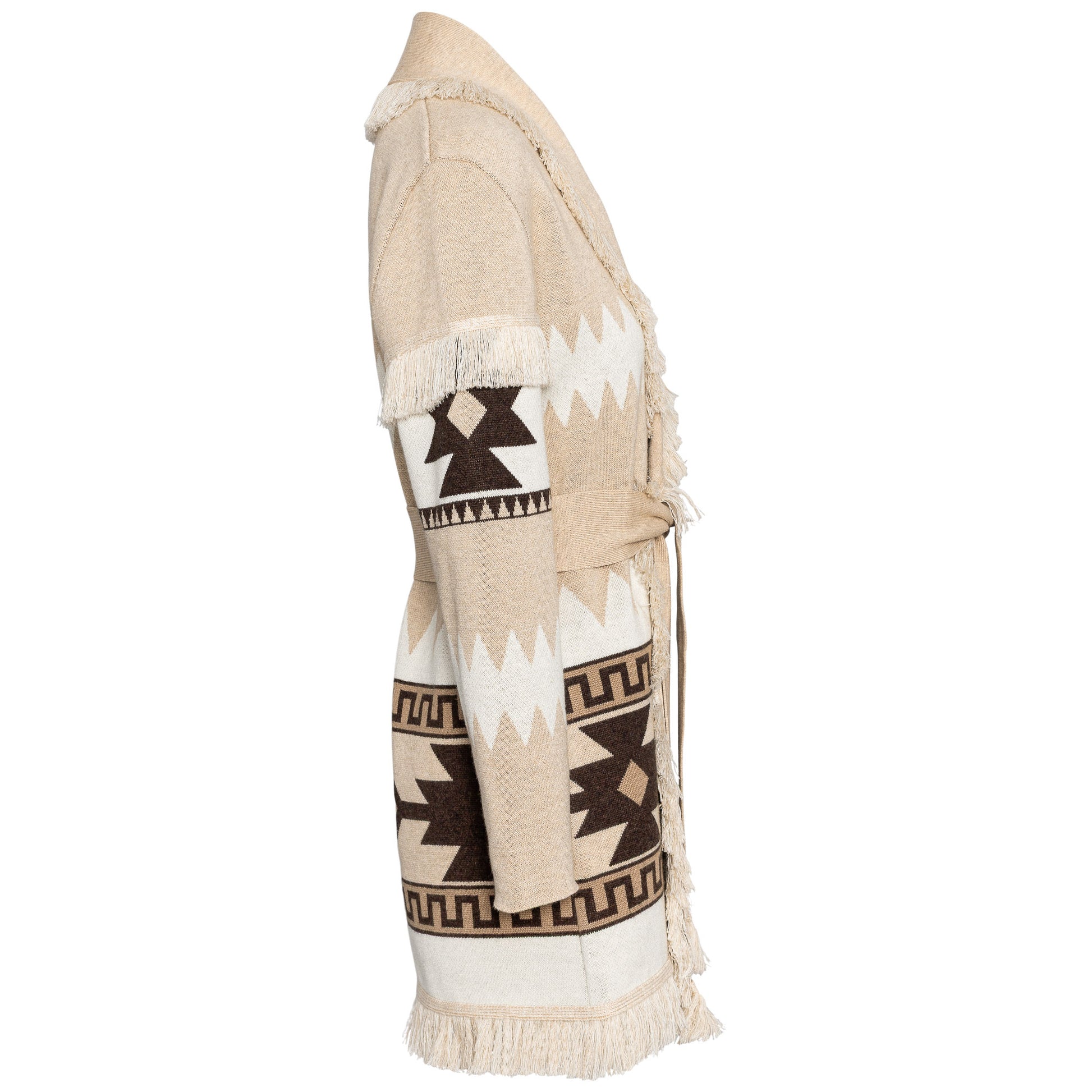 Wool blend cardi-coat with striped pique jacquard work, opening with fringes, matching belt.