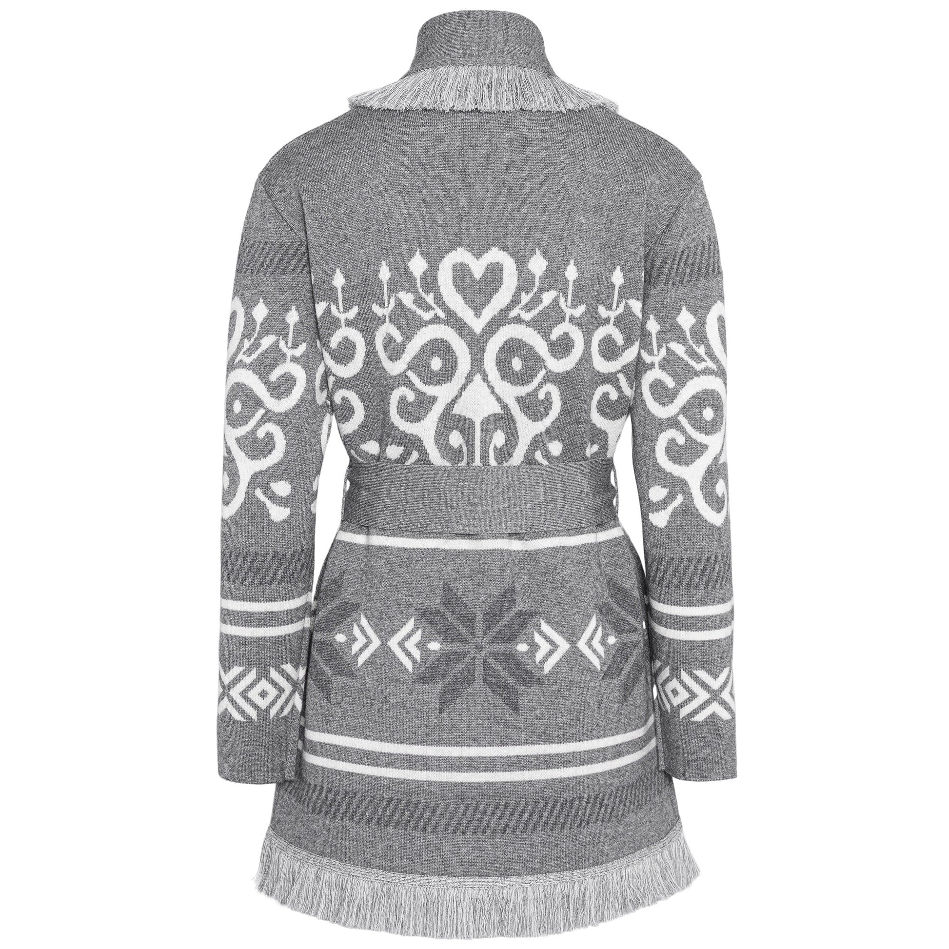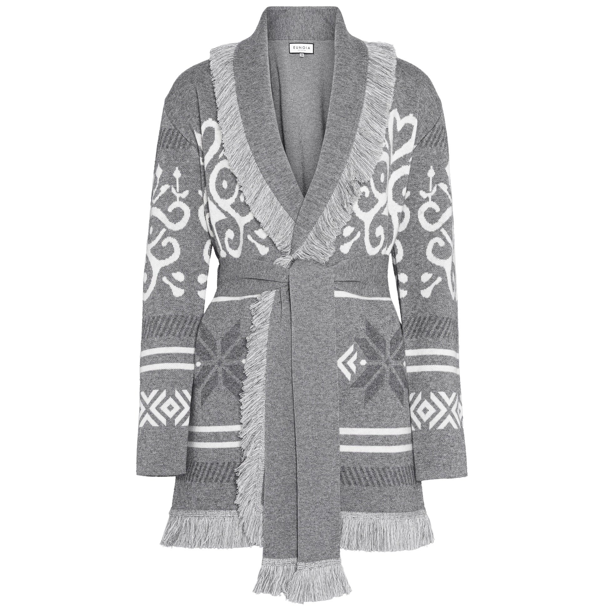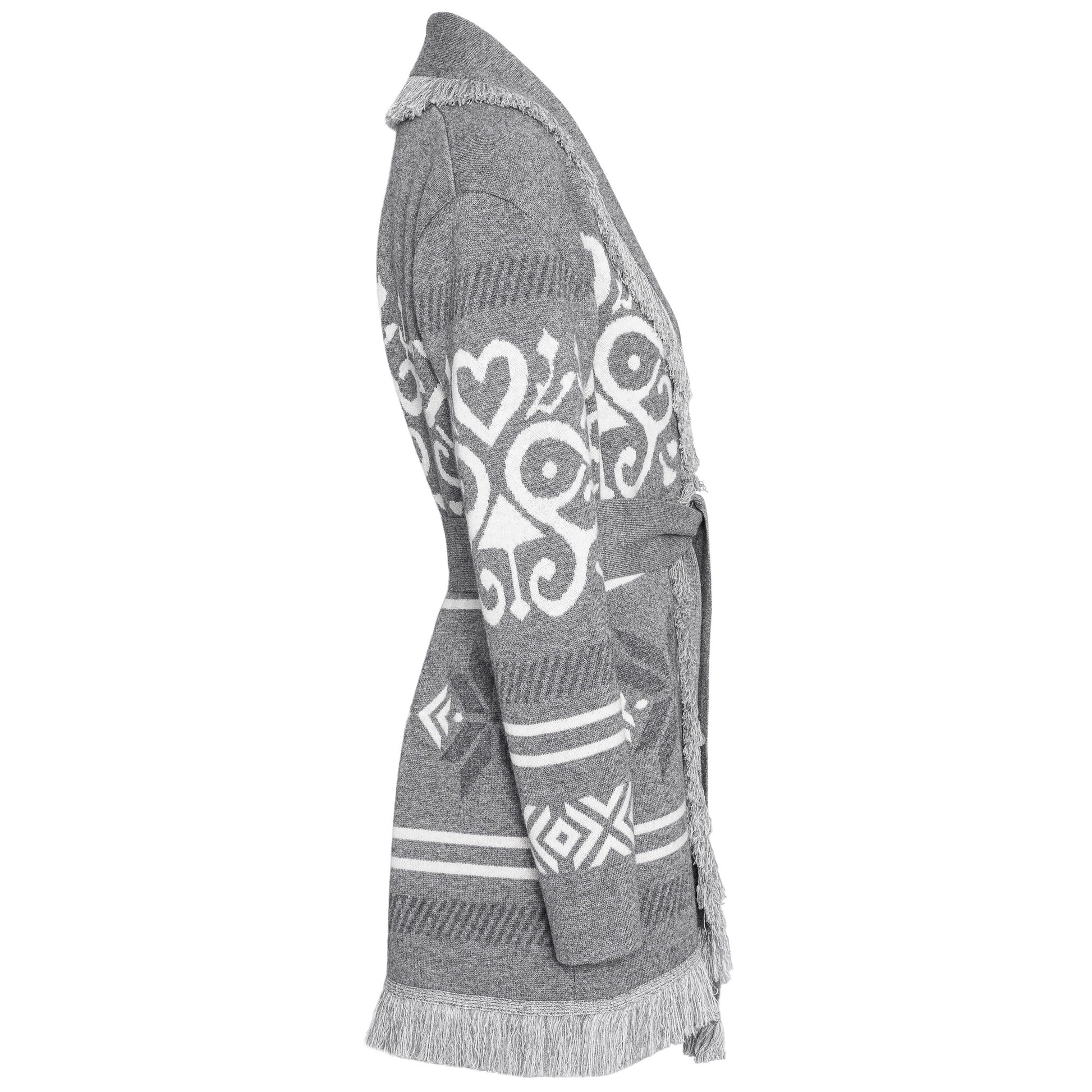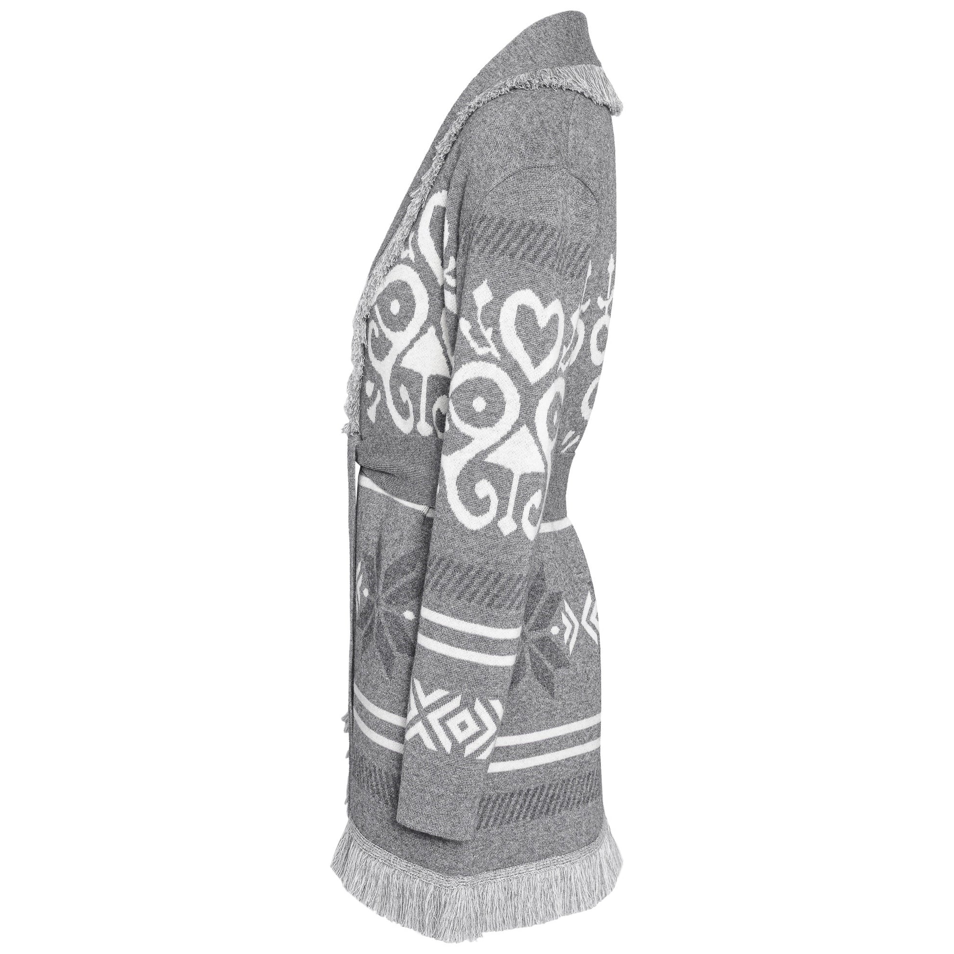Wool blend cardi-coat with striped pique jacquard work, opening with fringes, matching belt.