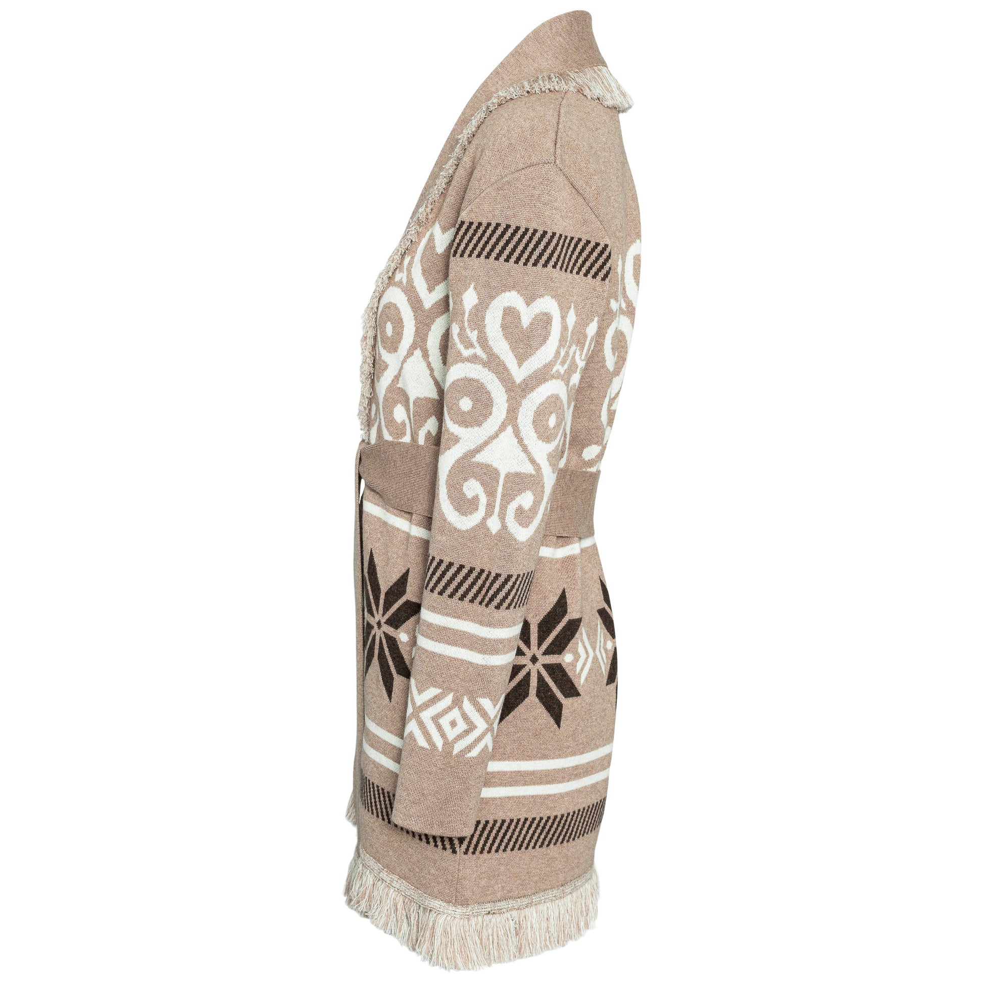 Wool blend cardi-coat with striped pique jacquard work, opening with fringes, matching belt.